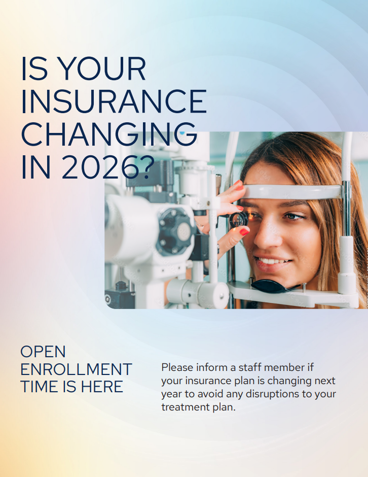 Let us know if your insurance plan or coverage is changing next year to avoid any disruptions to your treatment plan. Call us at (615) 983-6000 or email i@tnretina.com to avoid any disruptions to your treatment plan.