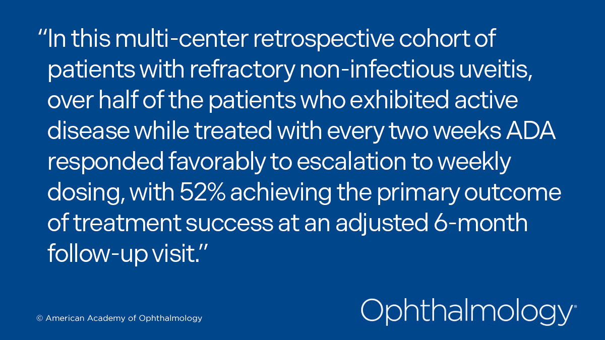 The study examined the outcomes of increasing adalimumab (Humira) dosing frequency for patients whose non-infectious uveitis (NIU) remained active despite standard biweekly treatment.