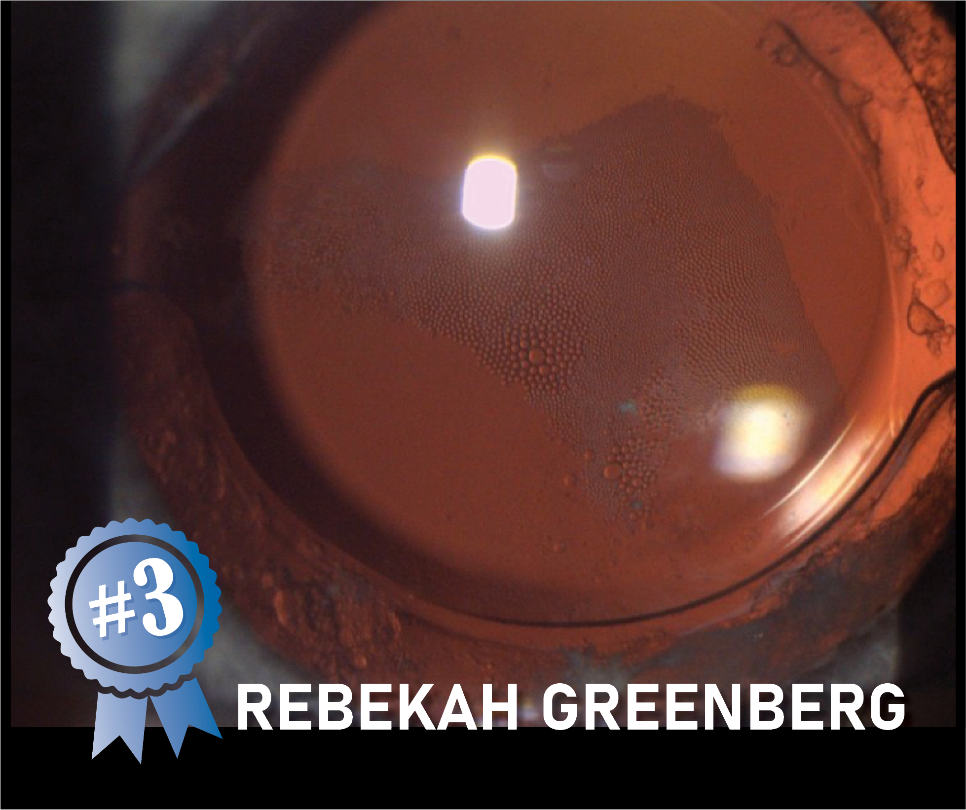 Image #3 is a photo of Emulsified Silicone Oil that was taken on our Slit Lamp camera by Rebekah Greenberg. Silicone Oil is sometimes used to treat retinal conditions such as complex retinal detachments. On occasion, the silicone oil can emulsify due to various conditions or longevity in the eye.