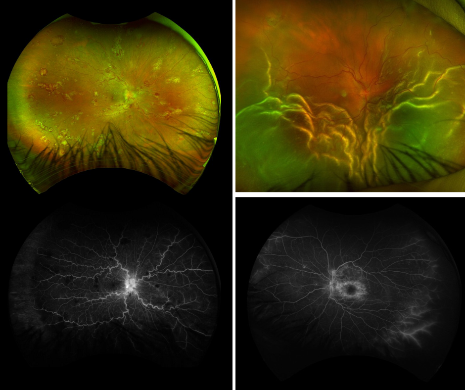 Image #1 is a photo of Leukemic Retinopathy. This image was captured on our OPTOS camera by Kristen Cross. Leukemic Retinopathy can be presented in someone who has been diagnosed with Leukemia. This is a type of blood cancer. This is due to an accumulated abnormal group of white blood cells located in the retina. Learn more about our Ocular Oncology department HERE